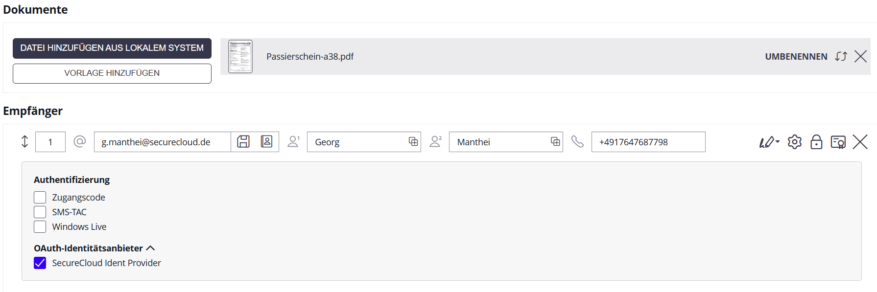 Abbildung 5: Beim Hinzufügen von Empfängern einer Unterschriftenmappe kann der zusätzliche Authentifizierungsschritt über das Schloss-Symbol ausgewählt werden.