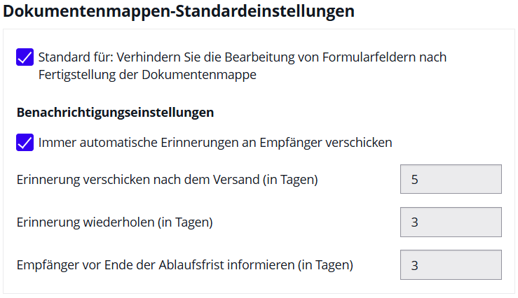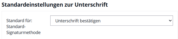 | Standard-Signaturtyp | Vorausgewählte Unterschriftsvariante bei neuen Feldern (z. B. „Unterschrift bestätigen", „Unterschrift aufzeichnen") |