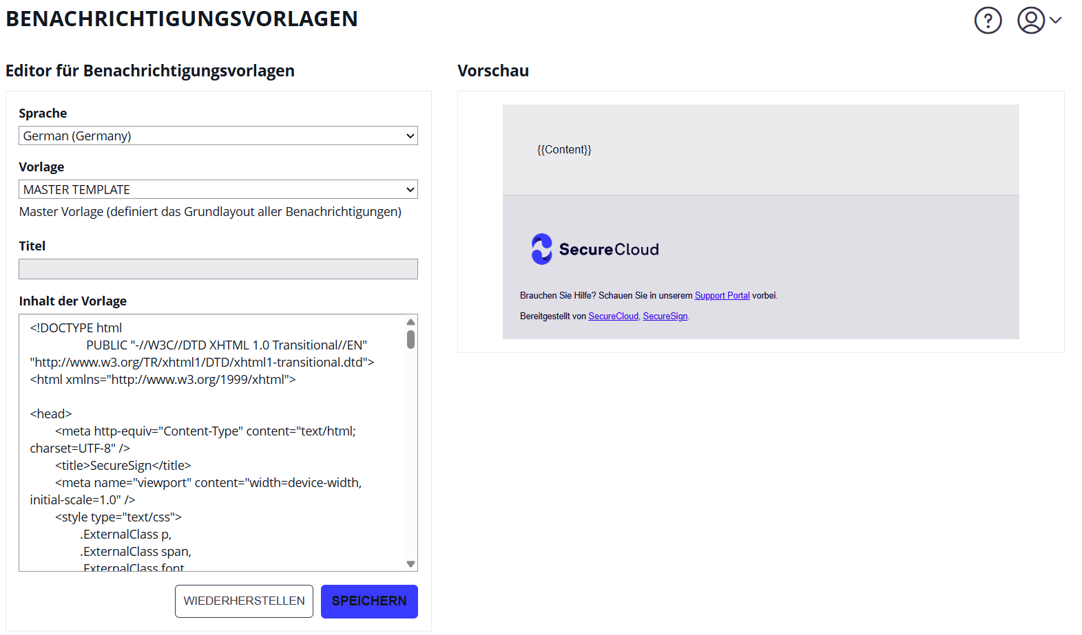 #EnvelopeName#) fügen dynamische Inhalte ein. - Klicken Sie auf „Speichern" – oder „Wiederherstellen" für den Systemstandard.