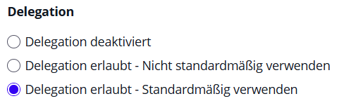 | Delegation – Richtlinie | Steuert, ob die Delegation automatisch erfolgt oder vom Absender bestätigt werden muss |