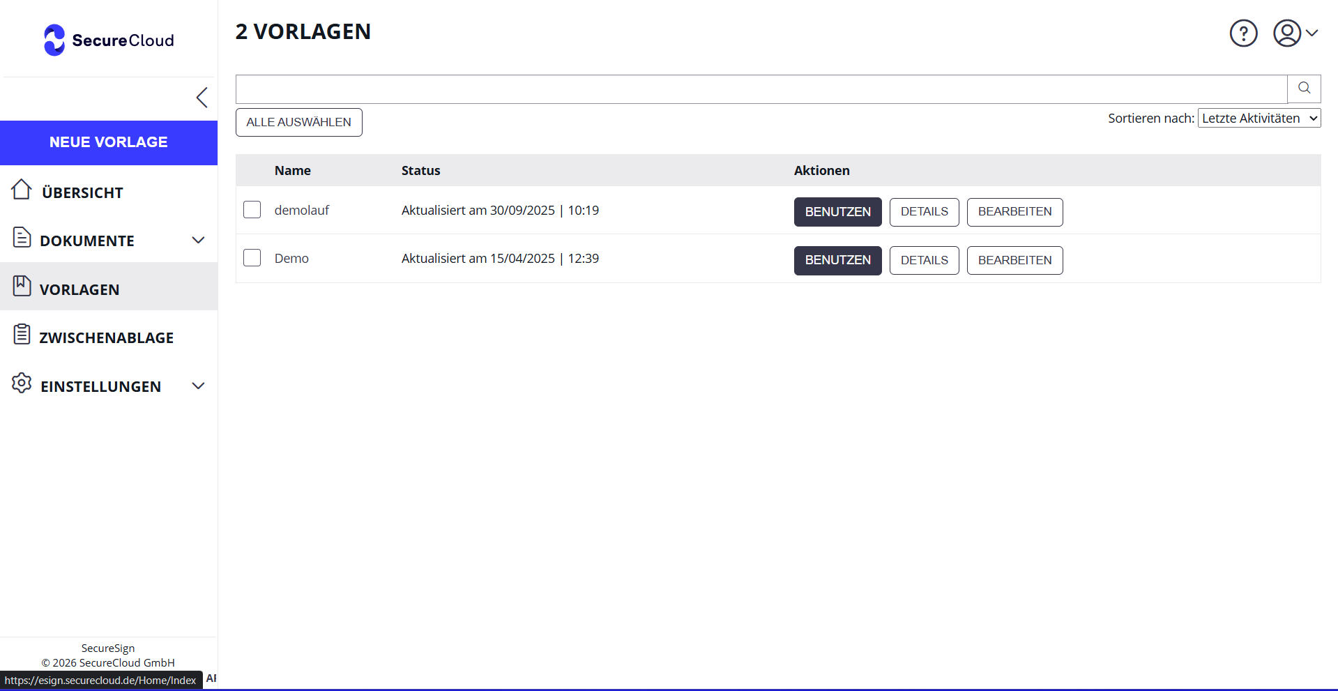 Eine Vorlage ist eine gespeicherte Unterschriftenmappe, die Sie immer wieder neu verwenden können – inklusive Dokument, Unterschriftsfeldern, Empfänger-Rollen und allen Einstellungen. Statt eine Mappe jedes Mal von Grund auf neu zu konfigurieren, starten Sie direkt aus der Vorlage heraus.