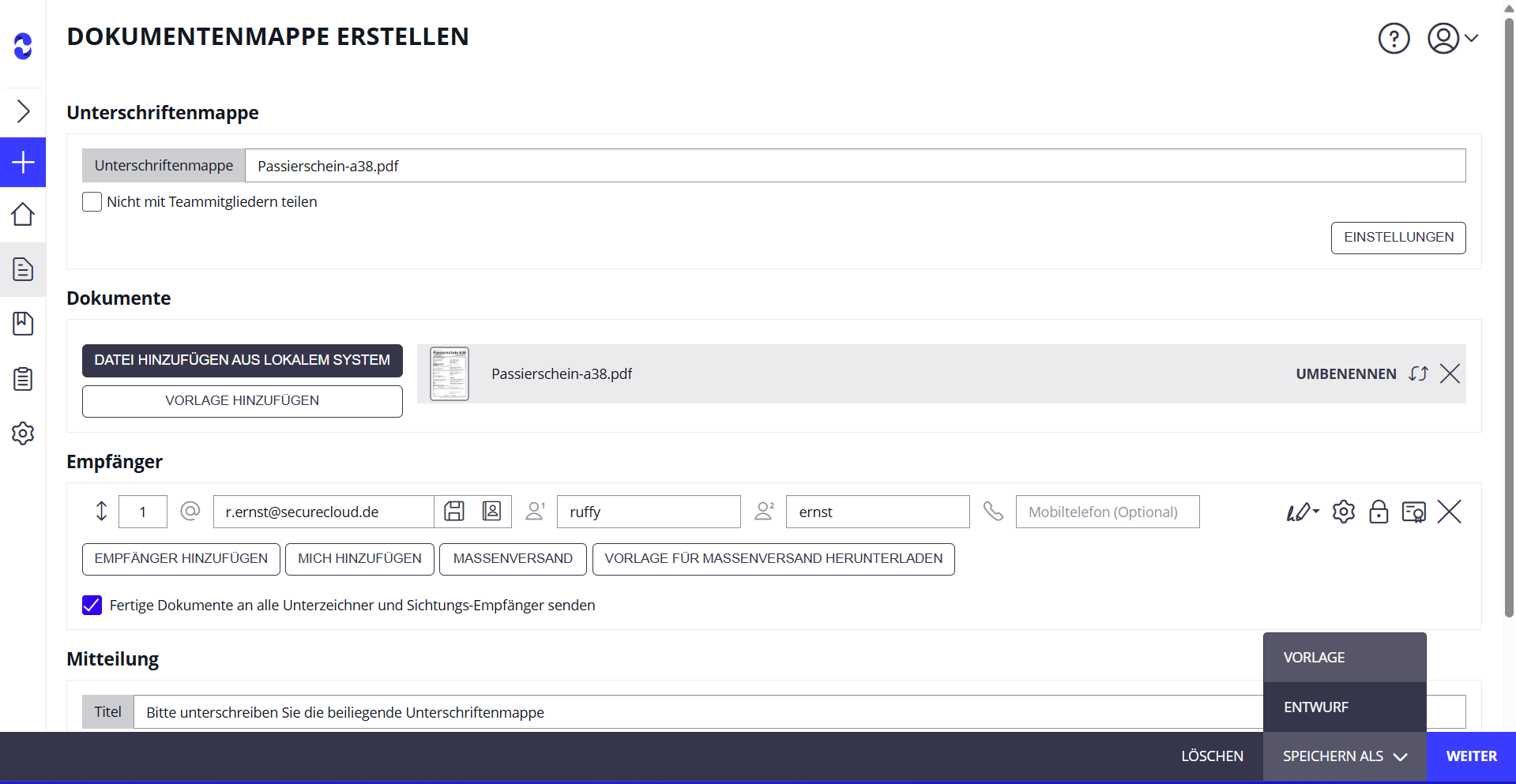 - Klicken Sie auf „Unterschriftenmappe versenden".